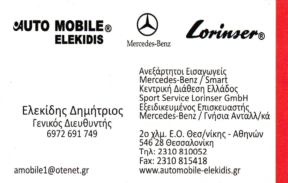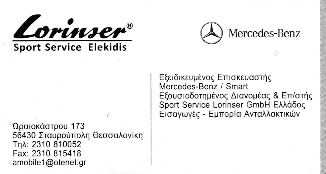 Ελεκίδης Δημήτριος Εξειδικευμένος Επισκευαστής Mercedes-Benz / Smart Εξουσιοδοτημένος Διανομέας & Επ/στής Sport Service Lorinser GmbH Ελλάδος Εισαγωγές – Εμπορία Ανταλλακτικών